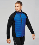 Polyamide ripstop quilted body. 90% polyester/10% elastane sleeves, sides and back. Polyester padding. Showerproof. Full length contrast zip. Two front zip pockets. Elasticated bound collar, cuffs and hem. Access for decoration.