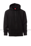 Men’s hoodie with full plastic zip with single customised pull, hood, matching colour drawstring and stitching, fitted sleeves, kangaroo pockets, stretch rib cuffs and hem. Reinforced seams, matching inner neck tape reinforcement.